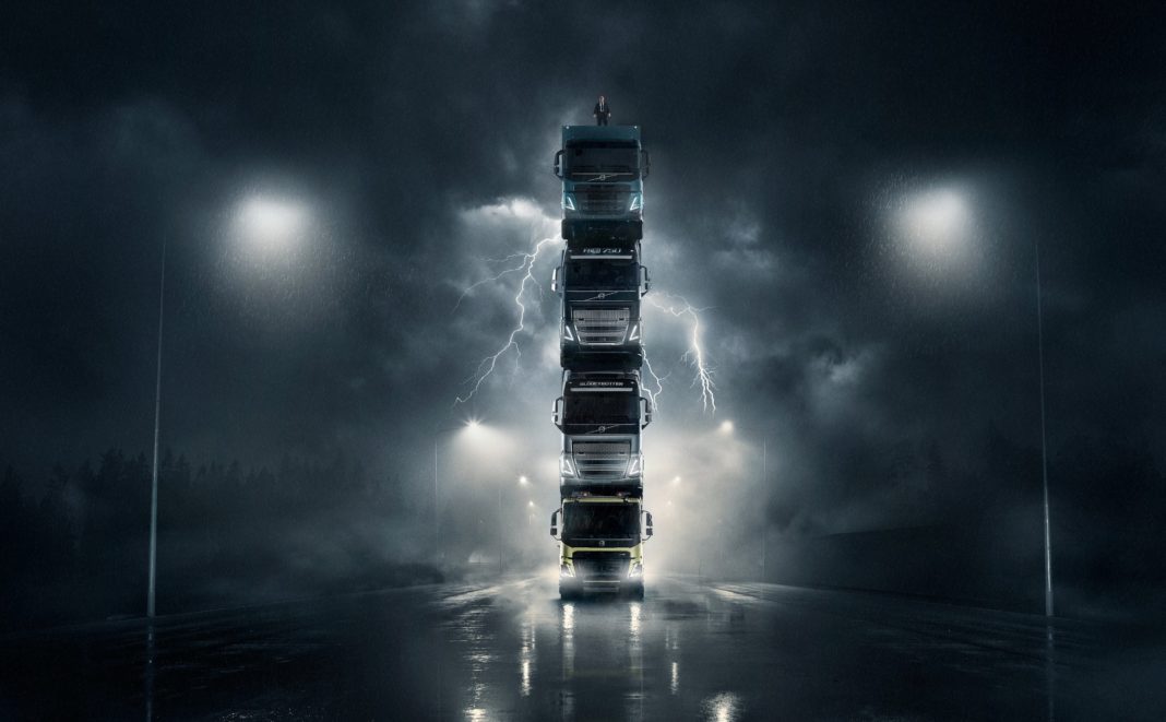 For at demonstrere styrken af de fire nye lastbiler byggede Volvo et kolossalt 15 meter højt og 58 ton tungt lastbilstårn ved at stable de fire nye lastbiler oven på hinanden. Derudover placerede de den administrerende direktør på toppen.