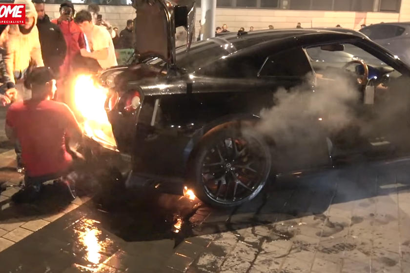 For før han fik set sig om, var flammerne godt i gang med at fortære bagpartiet på den japanske sportsvogn, der havde fundet vej ind blandt en folkemængde i London.