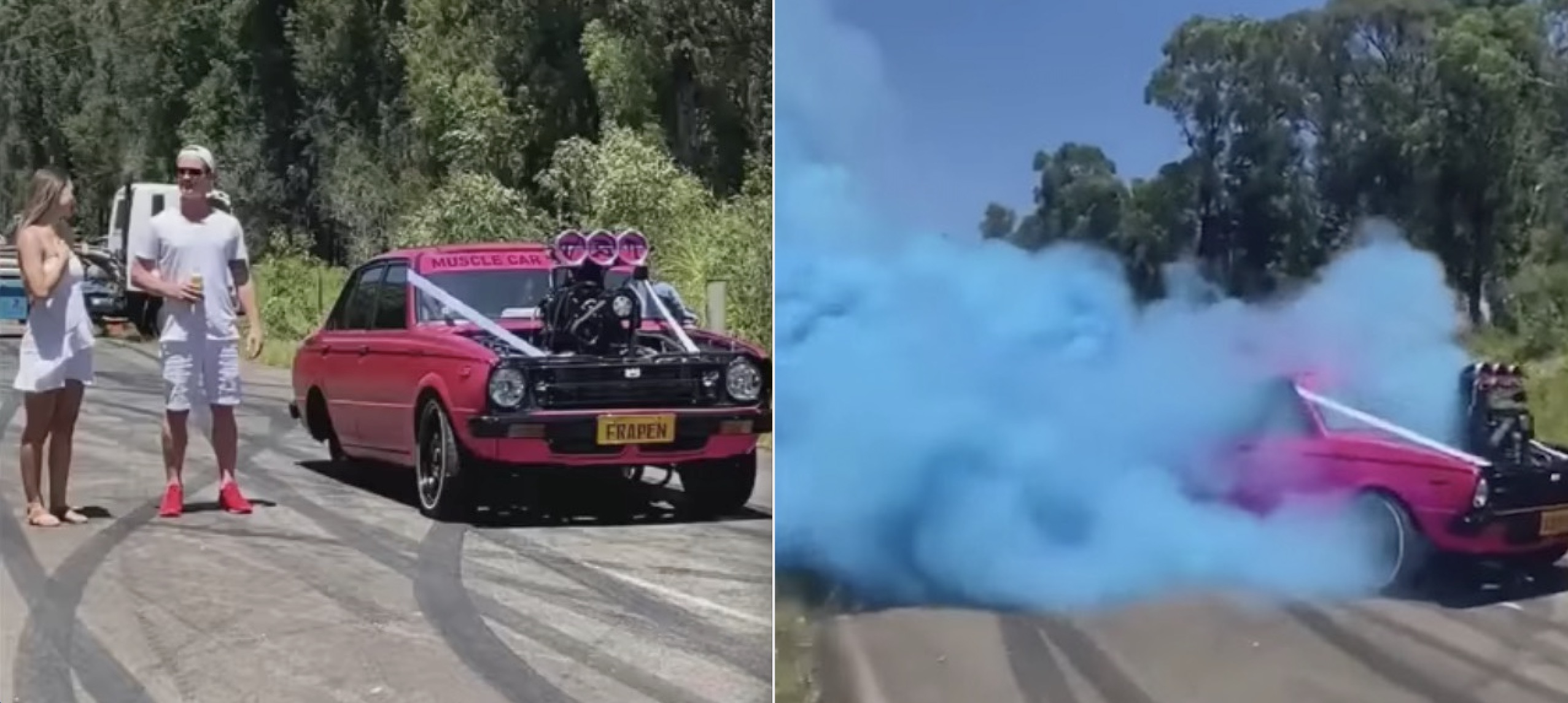 Herunder kan du opleve et par, der afslører kønnet på deres kommende baby ved hjælp af en hidsig bil.
