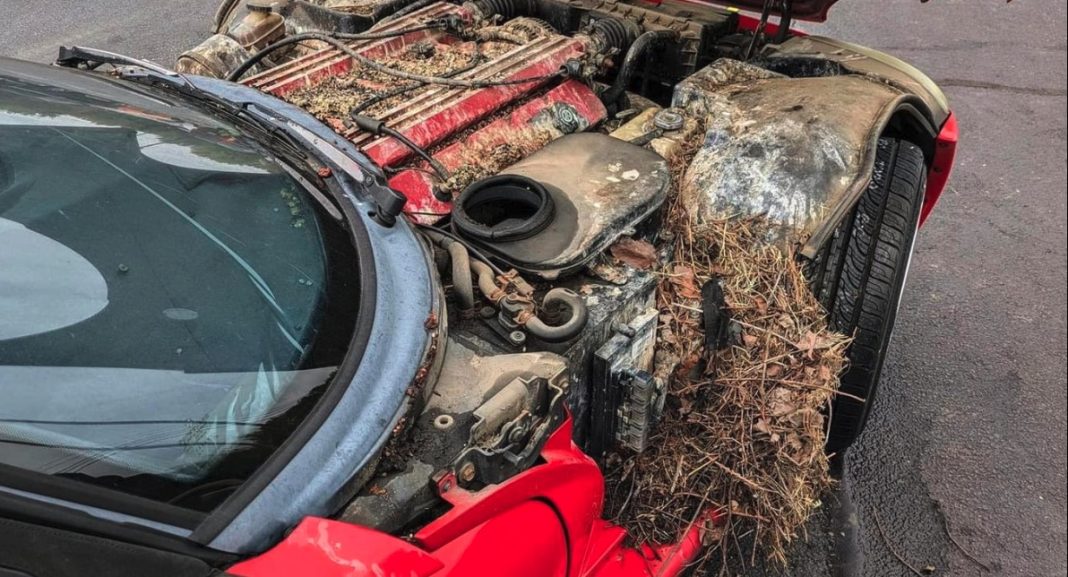 Store mængder halm bag Viperens forhjul tyder på, at fugle i årevis har taget bolig i bilen. Selve blokken er dækket af noget, der er mere brunt end noget andet. I hvert fald er det svært at se det oprindelige røde topstykke.