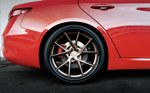 Herefter fik undervognen sig en tur. Med Eibach-sportsfjedre er bilen kommet 25 cm tættere på asfalten. Og det er hele vejen rundt. Altså uden at det er gået udover komforten. Du får altså ikke nyresten af en tur i den røde italiener her. Et hovedbrud har Alfa’en dog givet Artur. Den har nemlig ikke været nem at finde fælge til. Det krævede en del overvejelser, før valget faldt på et sæt IMAZ-hjul. De hedder noget så usexet som FF 689. Men skidt med det – når farven spiller.