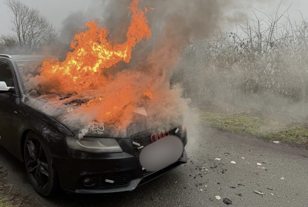 Søndag eftermiddag slap tre personer i en ældre Audi A4 med skrækken, da bilen brød ud i flammer i Augustenborg på Als.