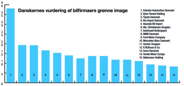 Så står det straks bedre til hos svensk-kinesiske Polestar der udgør toppen af rundspørgen. 38,2 af undersøgelsens adspurgte mener, at Polestar Automotive Denmark sender grønne signaler. Herefter følger Ejner Hessel der bl.a sælger Mercedes.