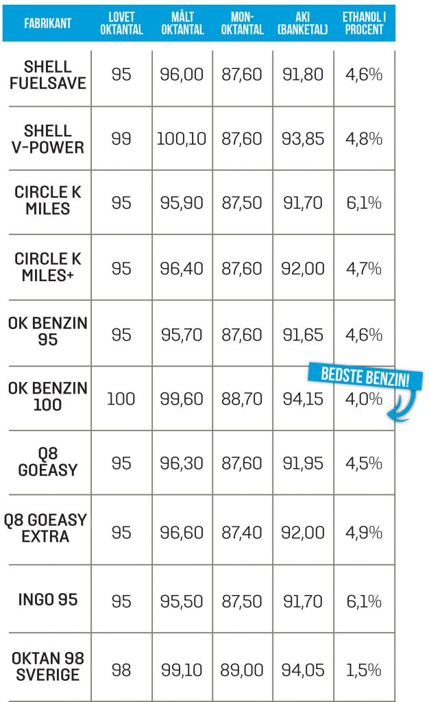 Her er det OK Benzin oktan 100, der vinder med marginaler foran den velkendte Shell V-power 99. Shell har dog allerede udmeldt, at de i nær fremtid også opgraderer alle V-Power standere til oktan 100, og så står vi klar med testeren igen, for at se, hvad det gør ved benzinen. Testens nederste benzintype er udelukkende lavet, fordi det var interessant at sammenligne med en svensk oktan 98 – den kan selvfølgelig ikke tankes på standere i Danmark.