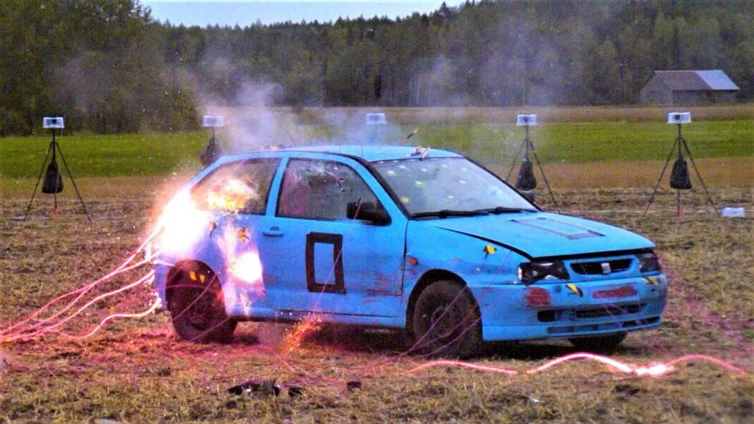 For at fange så meget som muligt af de mange eksplosioner satte holdet bag 70 super slowmotion-kameraer op rundt omkring den stakkels Seat.