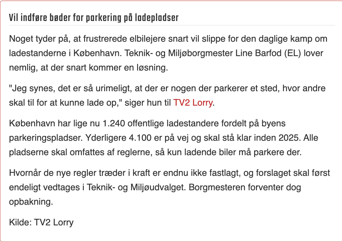 Jeg bliver småarrig, når jeg kan se, at blot tre ud af de seks biler holder og lader! De øvrige tre, har valgt at se det som en nem mulighed at få en parkeringsplads. De er i bund og grund i deres fulde ret til at parkere der uden at lade – fordi Københavns Kommune har ikke indført tidsbegrænset parkering ved ladestandere.