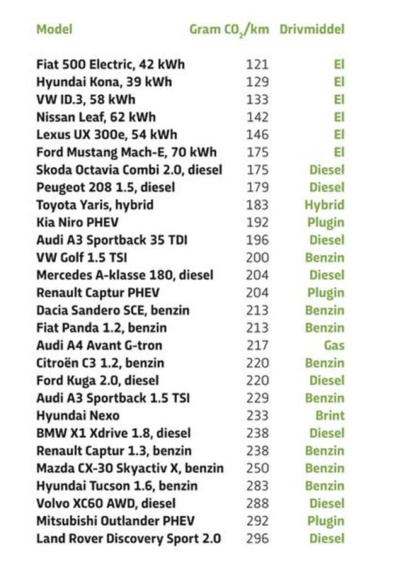 Undersøgelsen konkluderer også, at den ‘sorteste’ elbil udleder lige så meget Co2 pr. kilometer som ‘den grønneste’ dieselbil. Nemlig 175 gram.