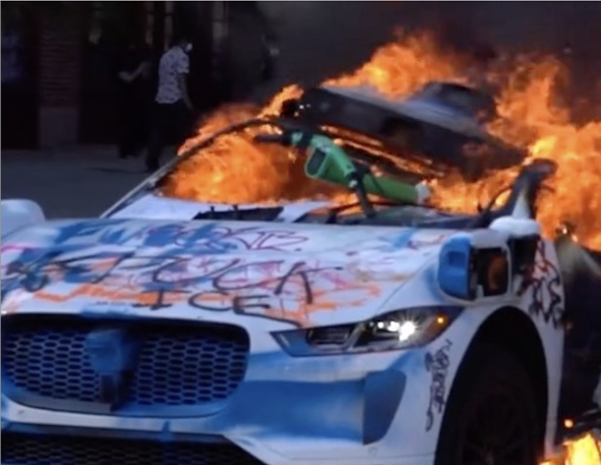 Dengang satte en gruppe demonstranter ild til en Waymo-bil med fyrværkeri. Bilen brændte helt ud.