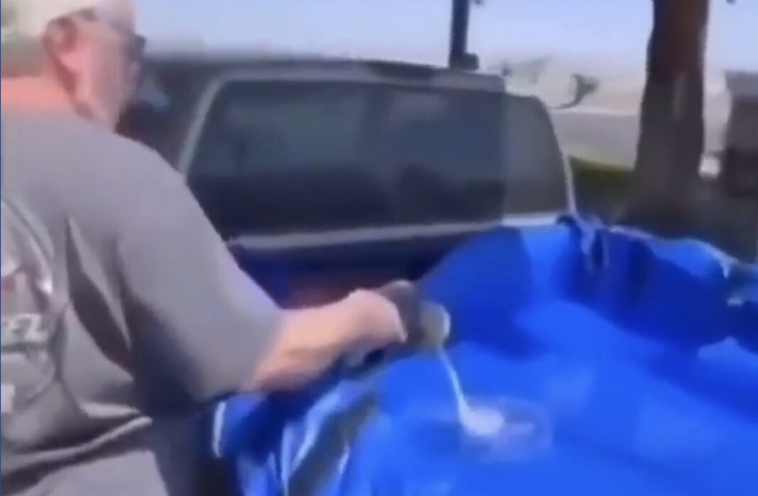 En ældre herre er øjensynligt i gang med at hælde et par hundrede liter brændstof i sin pickup-truck. Dog ikke i bilen tank, men op pÃ¥ ladet…