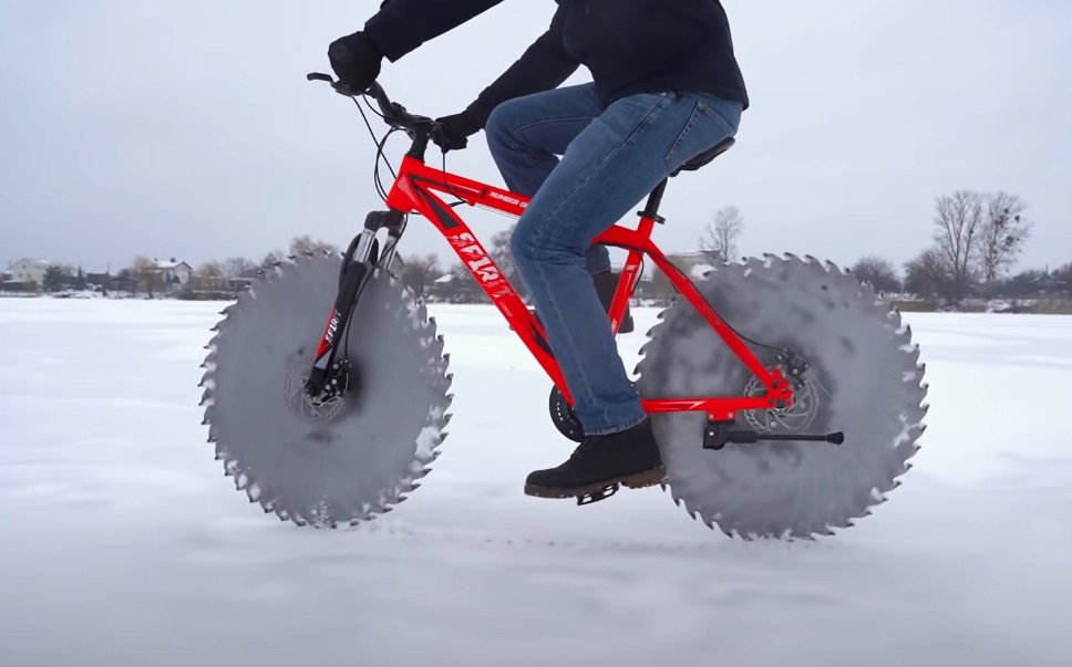 Det er rigtigt, men hvis du skifter dækkene ud med noget andet, så er det en helt anden sag. Som herunder, hvor en gut laver sine egne savklinger i overstørrelse og monterer dem i stedet for cykelhjulene på sin mountainbike.