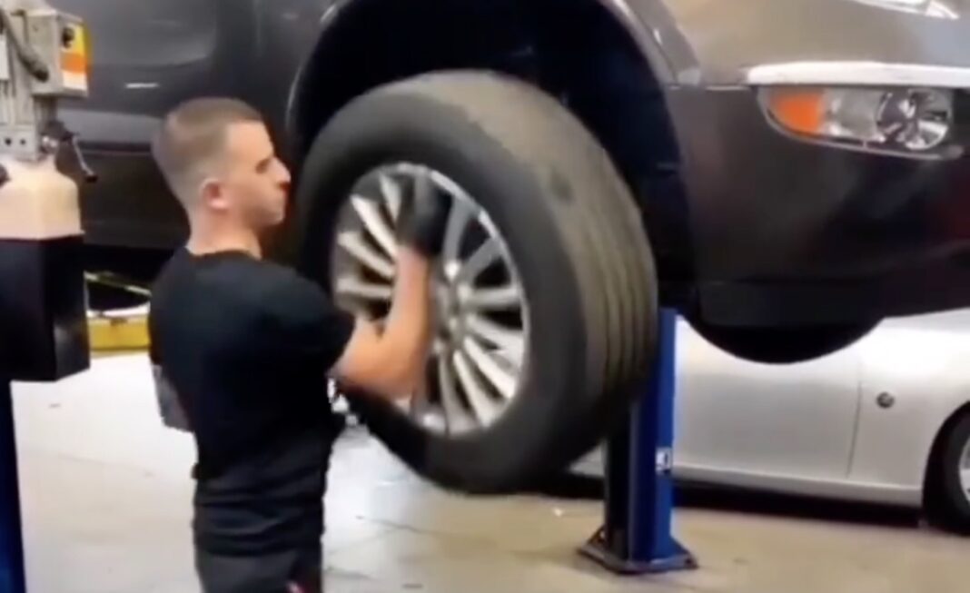 Hjul kan være tunge, og det kræver altid to hænder at løfte dem på plads. Men ikke for gutten i videoen herunder.