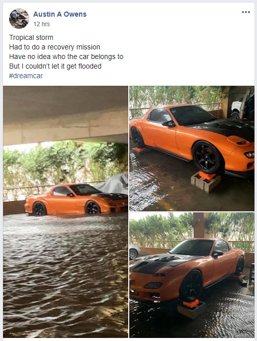 Tag gutten her eksempelvis. Austin Owen hedder han. Under stormen Cristobal så han et billede af denne orange Mazda RX-7 parkeret i et parkeringshus. Det er der ikke noget usædvanligt i.