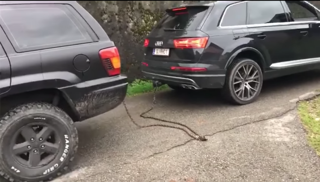 En flok gutter fra Østrig kunne ikke blive enige om, hvilken af deres firehjulstrukne biler, der var bedst – det bliver afgjort med et godt gammeldags krog-træk.