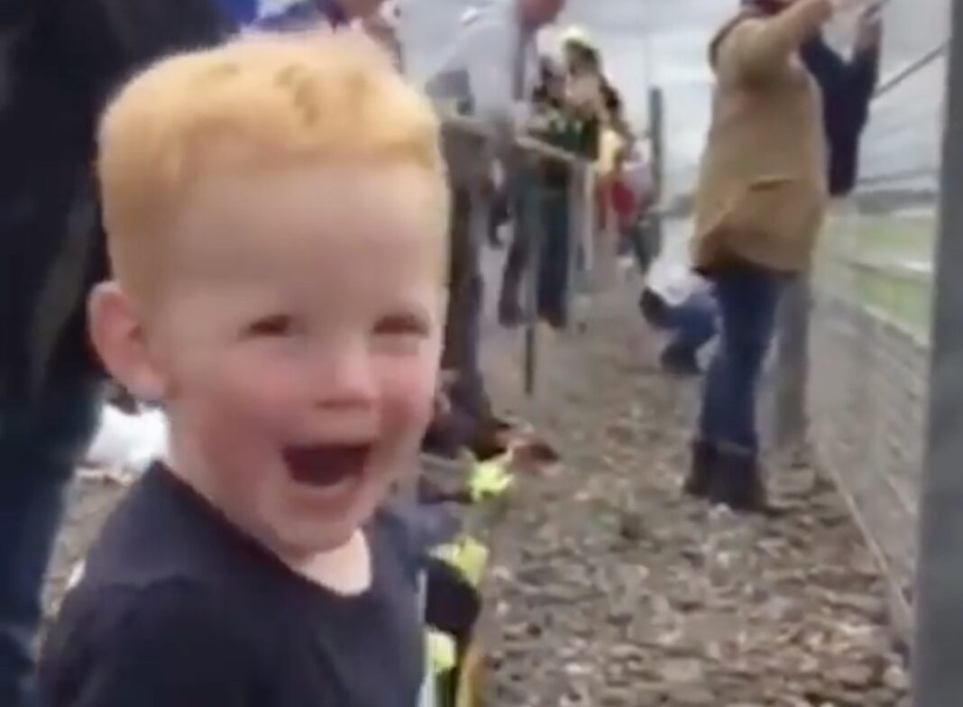 Og det er præcis, hvad der sker i videoen her. Den lille purk kan slet ikke være i sin egen krop, da de hidsige racere – det er vist motorcykler – kommer drønende forbi for fuld skrald.