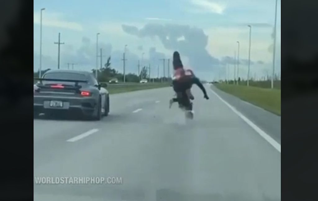 Her har vi fat i en makker, der har udfordret en Porsche 911 til en lille dyst på motorvejen. Men desværre for gutten på motorcyklen har han ikke helt styr på det med at accelerere hurtigt.