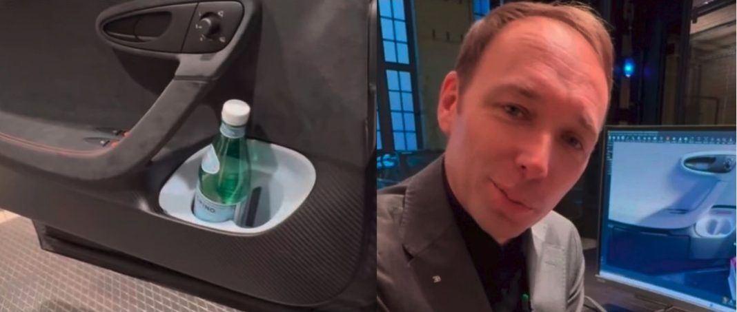 Men det er der nu. Frank Heyl demonstrere, hvordan den produktionsklare kopholder kan sidde i døren på mærkets sidste W16-model. Nemlig den topløse Bugatti Mistral som i øvrigt er verdens hurtigste roadster med en tophastighed på 455 km/t.