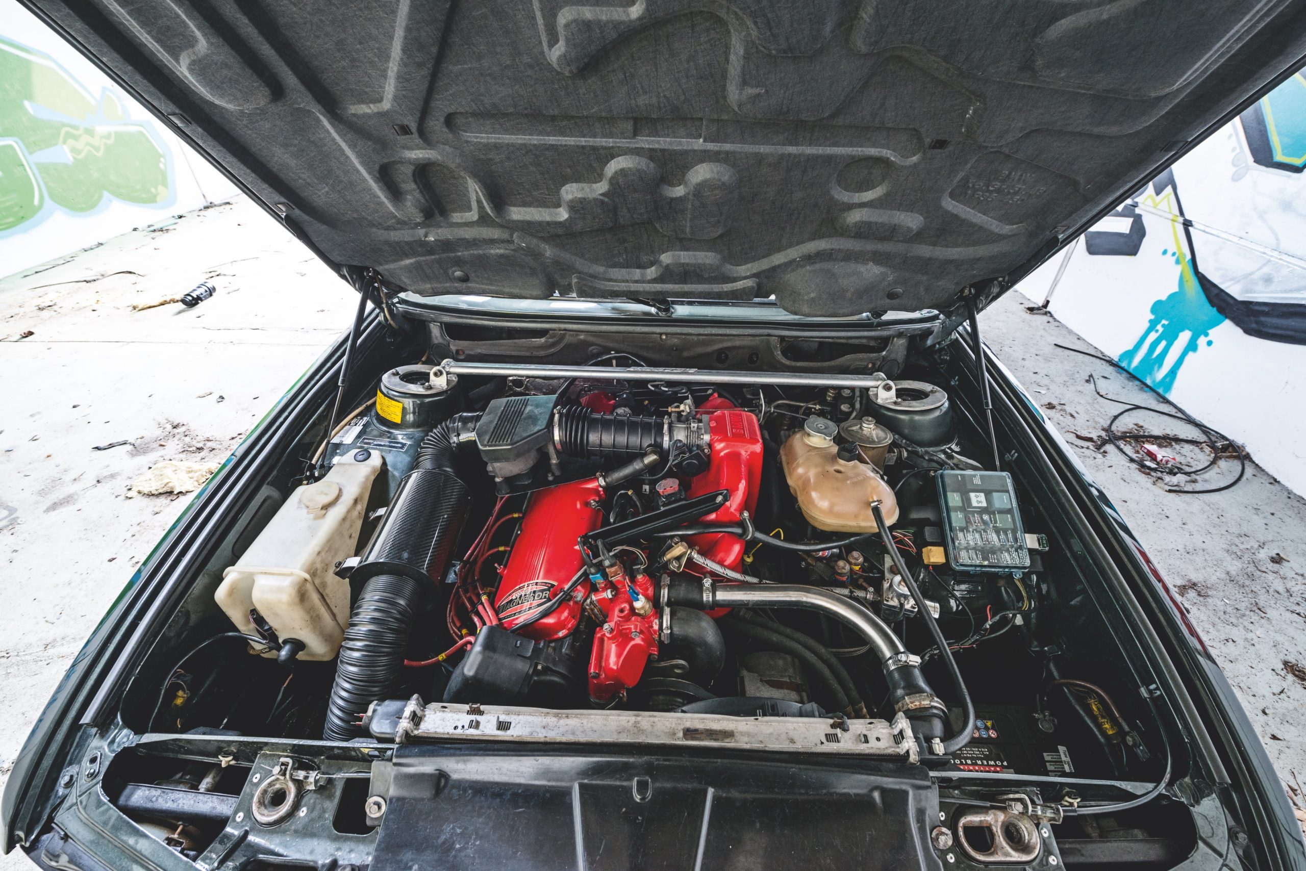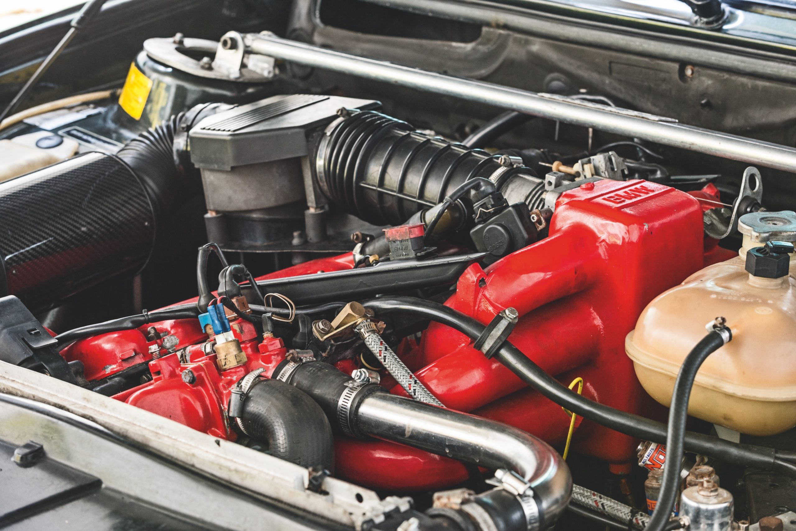 MOTOR: M30b32 • total renoveret med nye ventilstyr, vippearme, kæde, fjedre, pakninger med mere • bearbejdet topstykke • 290 graders Dbilas knast • strammere dobbelte ventilfjedre • rustfri manifold fra Hartge – pakket ind i PowerWrap • NGK Iridium tændrør • Magnecor tændkabler • Carbon Dynamic Airfilter fra BMC • komplet motorstyring fra en 3,4 liters motor (535i) • SJK chip • begrænser hævet til 7.100 o/min • justerbar benzintryksregulator • NOS wetkit • 2 stk. elblæsere • 2 x 2” hele vejen med en enkelt potte • Hartge udstødningstip