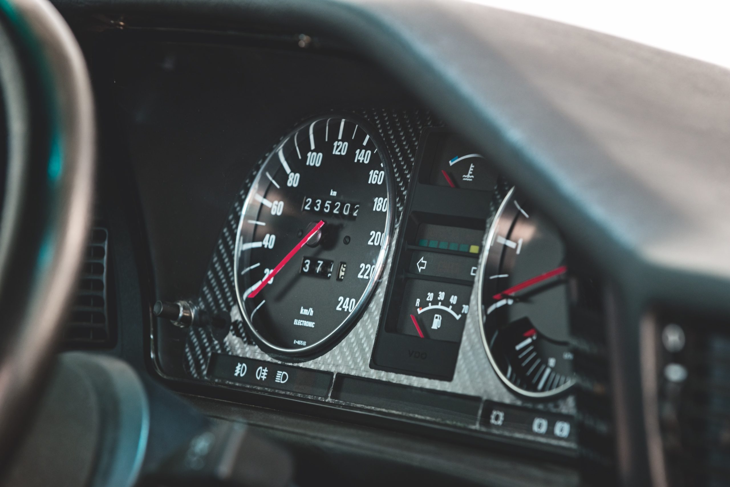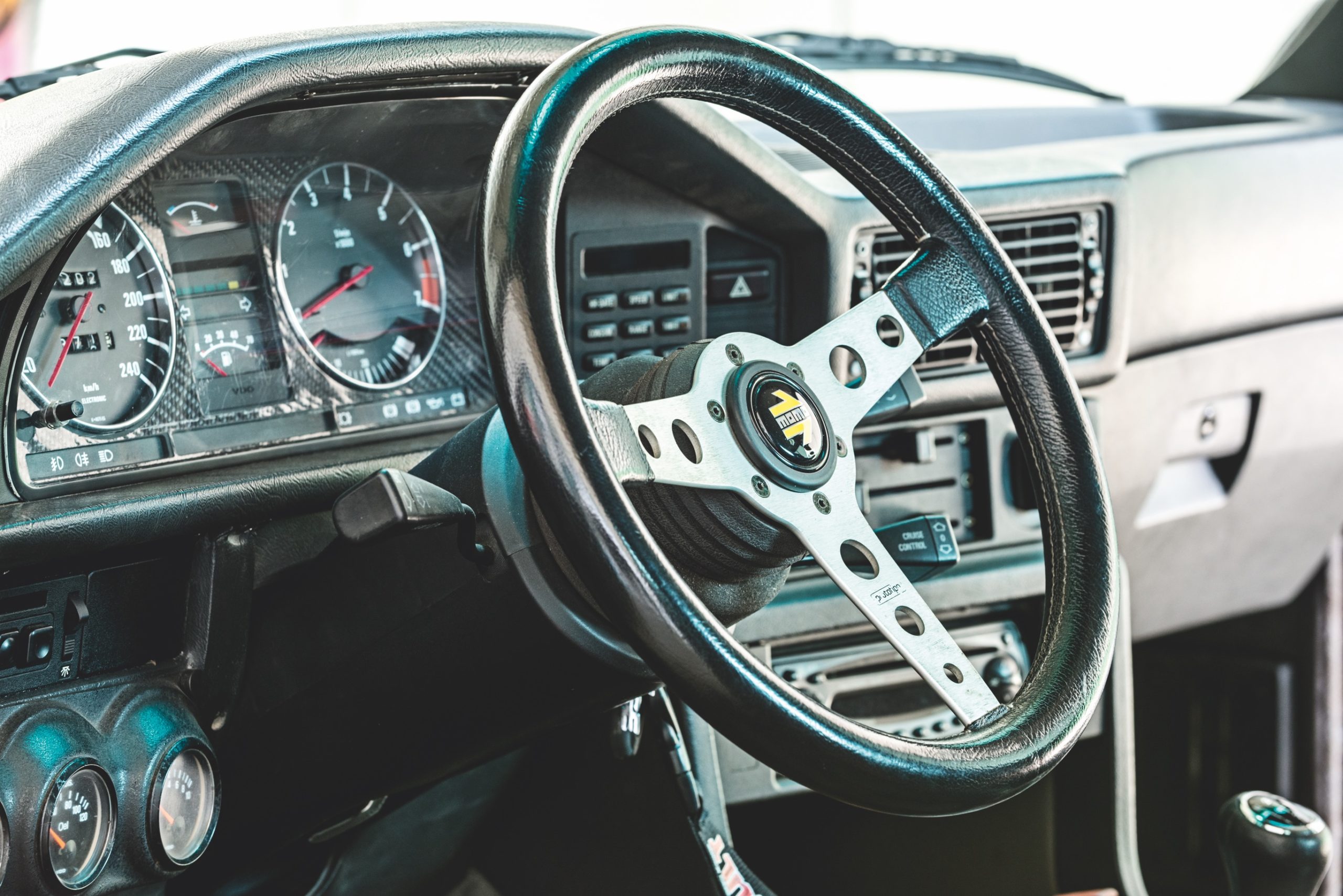 KABINE: Alt det originale grønne instrumentering og dørsider er blevet udskiftet med mørkt/sort i stedet • mørk bagsæde og hattehylde • Recaro forsæder – førersæde med el, luft og justerbare puder, passagersæde med elvarme • røde Shroth h-seler • brandslukker monteret under forsædet • Momo Prototipo sportsrat med tilhørende nav • gearknop og manchet i sort læder • instrumentering med carbon baggrund, aluringe og røde nåle • gauge pod under lyskontakter med olietryk, olietemperatur og voltmeter