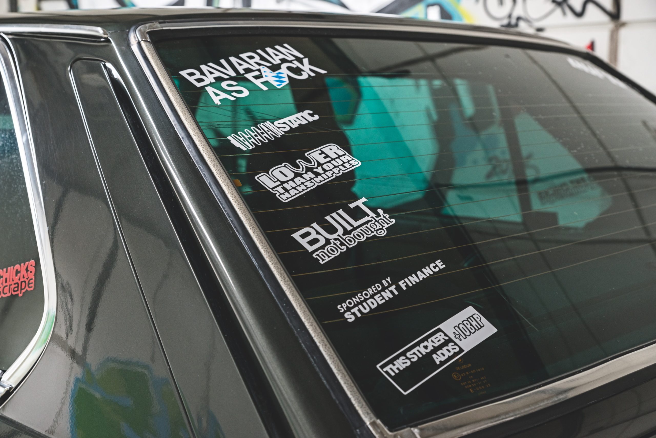 KAROSSERI: Mørkegrøn toning af alle ruder • blanksort frontgrill med røde GTI-detaljer • indsugning i stedet for højre fjernlygte • Rød pin stripe-lignende staffering langs siden af bilen • blanksorte sidespejle, b-stolper og dørhåndtag • klare blinkglas foran • klare blinkglas på forskærme • Pfeba Type 187 frontskørt • Hartge tårnstiver • carbon emblemer • røde US baglygter • Mtec pærer: H4 Super White, H1 Super White, H3 Cosmos Blue • diverse klistermærker på ruder og frontskørt • engelske plader som showplader • original lak – 177 Achatgrön Metallic