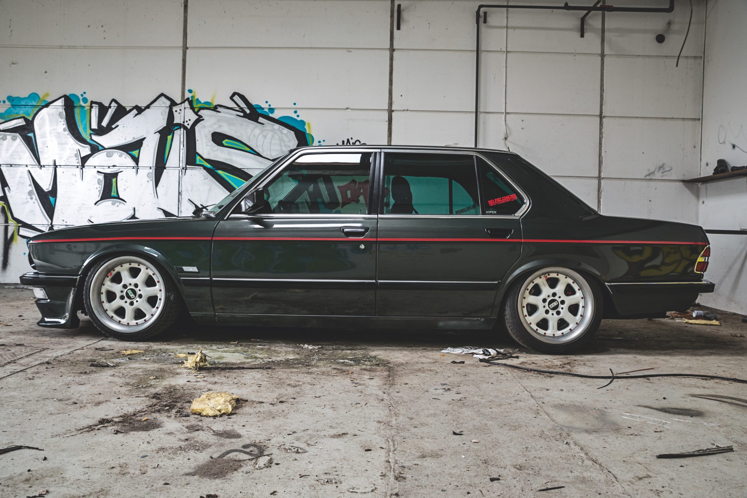 Lad os lige give dig tre grunde til, at Nikkis E28 har vundet vores hjerter. 1: Den er skamlav. Frihøjde ifølge Nikki på 1,5-2 cm, og det ser pissegodt ud! 2: Fedt motorskifte, der giver god lyd og masser af opmærksomhed. 3: Undervognen, der er hjemmelavet af en undervogn til den nyere BMW E39 5-serie.