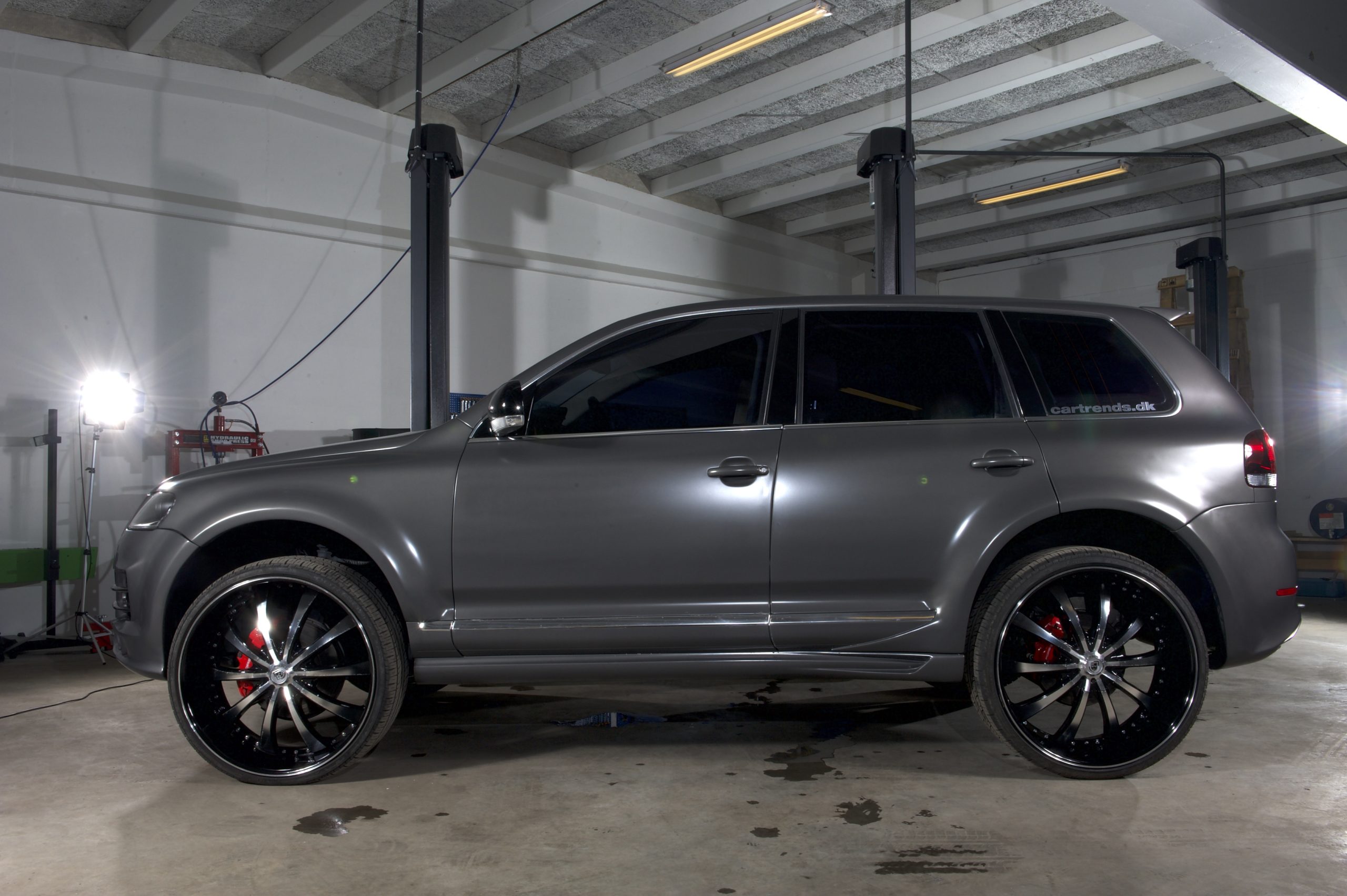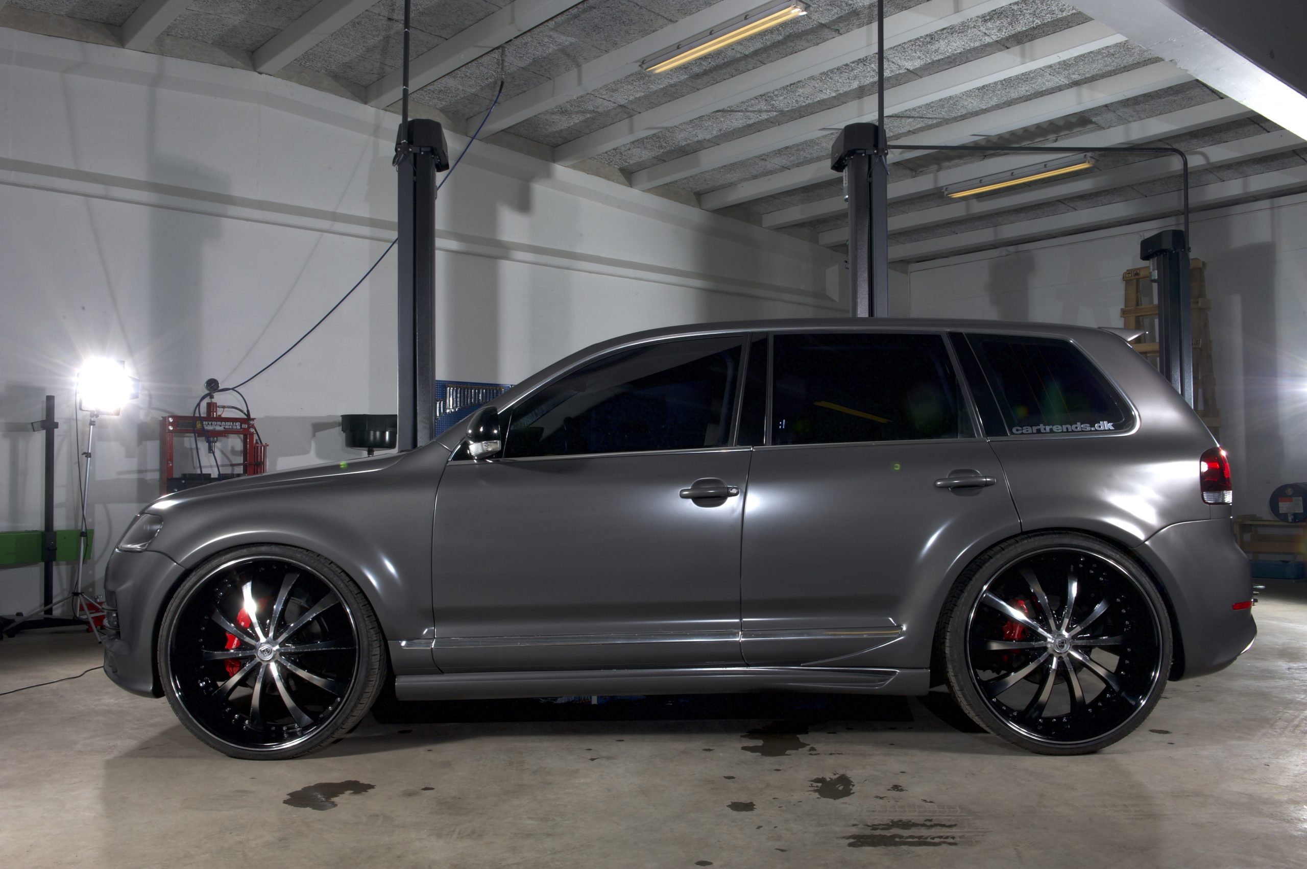 Renés Touareg er født med en original luftundervogn, der normalt kun kan justeres meget lidt. Derfor har han monteret nogle justerbare målestænger, der snyder luftundervognens automatiske justerings-sensor.