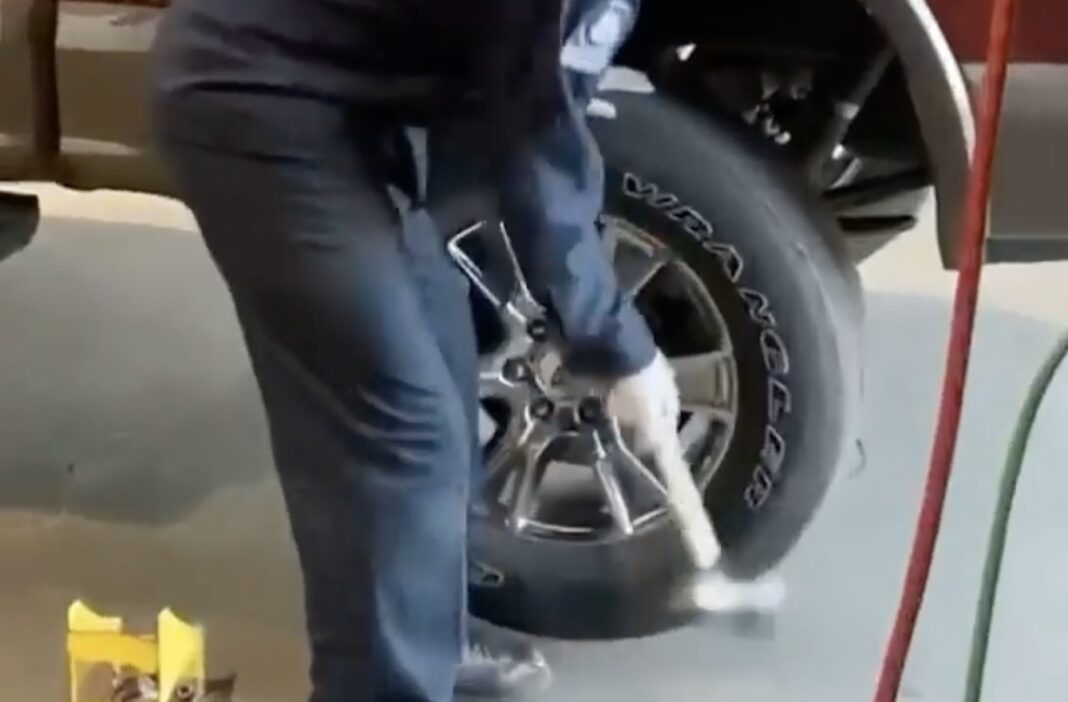 En mekaniker bakser med at få et hjul af, og det sidder uhjælpeligt godt fast, så han tager de grove metoder i brug.