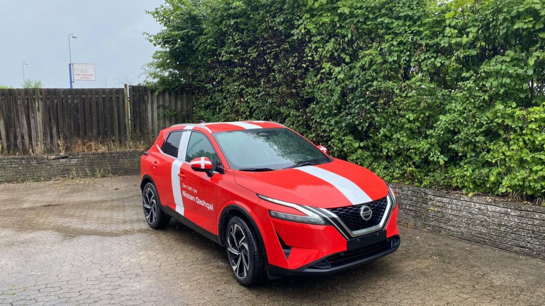 Faktisk så klar, at de har nuppet en af de helt nye udgaver af Nissan Qashqai direkte ud fra færgen på Esbjerg havn – og viklet den godt og grundigt ind i folie med Dannebrogs-tema.