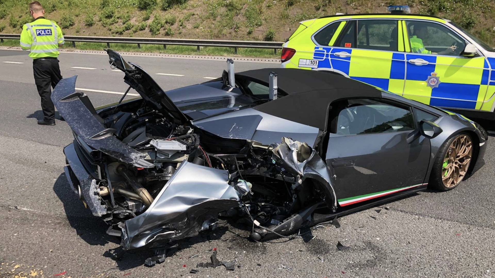 I første omgang skete det ganske udramatiske, at Lambo-ejeren på motorvejen måtte trække ind pga. en ‘mekanisk defekt’, som det beskrives af engelsk politi på Twitter.