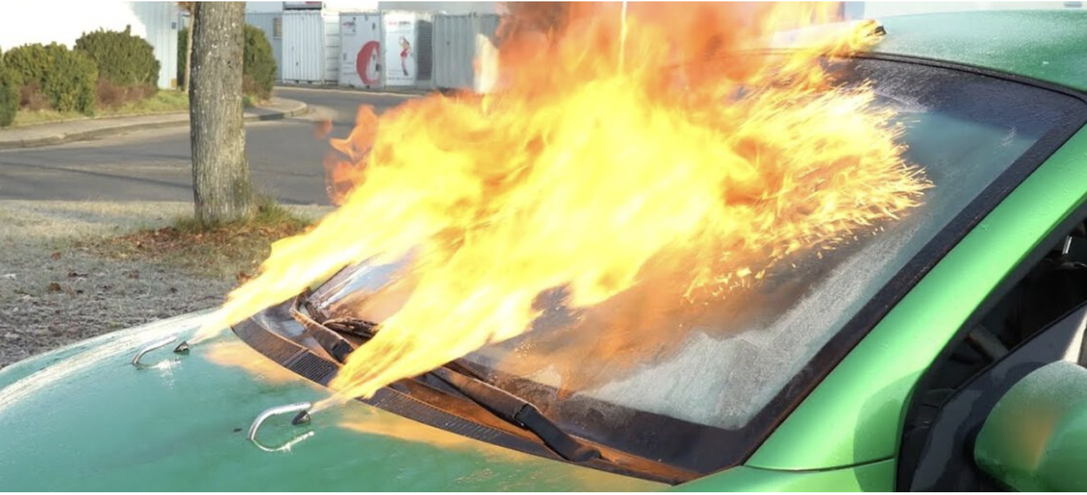 Så prøve en flammekaster. Eller rettere to. Du kan bruge sprinklerdyserne, som alligevel sidder på din bil. Fyld dem med alkoholen Isopropanol – og…