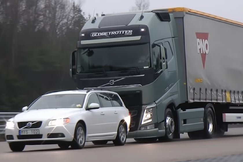 Det betyder en totalvægt på 40 ton. Alligevel er nødbremsesystemet i stand til at bremse lastbilen helt ned. Den langsommere kørende foran går helt fri. Selvom den tons-tunge lastvogn er bare millimeter fra kofangeren.