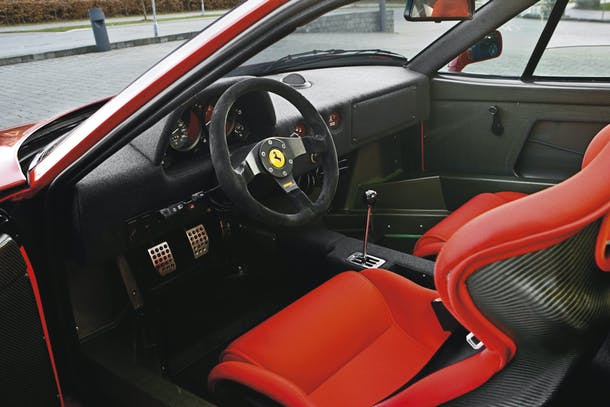 Den perfekte køreoplevelse opnåes vel at mærke, hvis chaufføren ikke er over 183 cm høj. De ydre mål antyder, at det er en stor bil. Men store biler er tunge og dermed ikke hurtige, og reelt er F40 forbavsende lille og kompakt. Den vejer bare 1.100 kg.