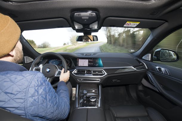 Det er som at sidde i en høj BMW 5-serie opgradret fra business til første klasse. Komfortsæderne i testbilen er betrukket med det blødeste, tykke læder, og de knuger én ind til sig, da jeg vækker V8-motoren og aktiverer køreprogram Sport.