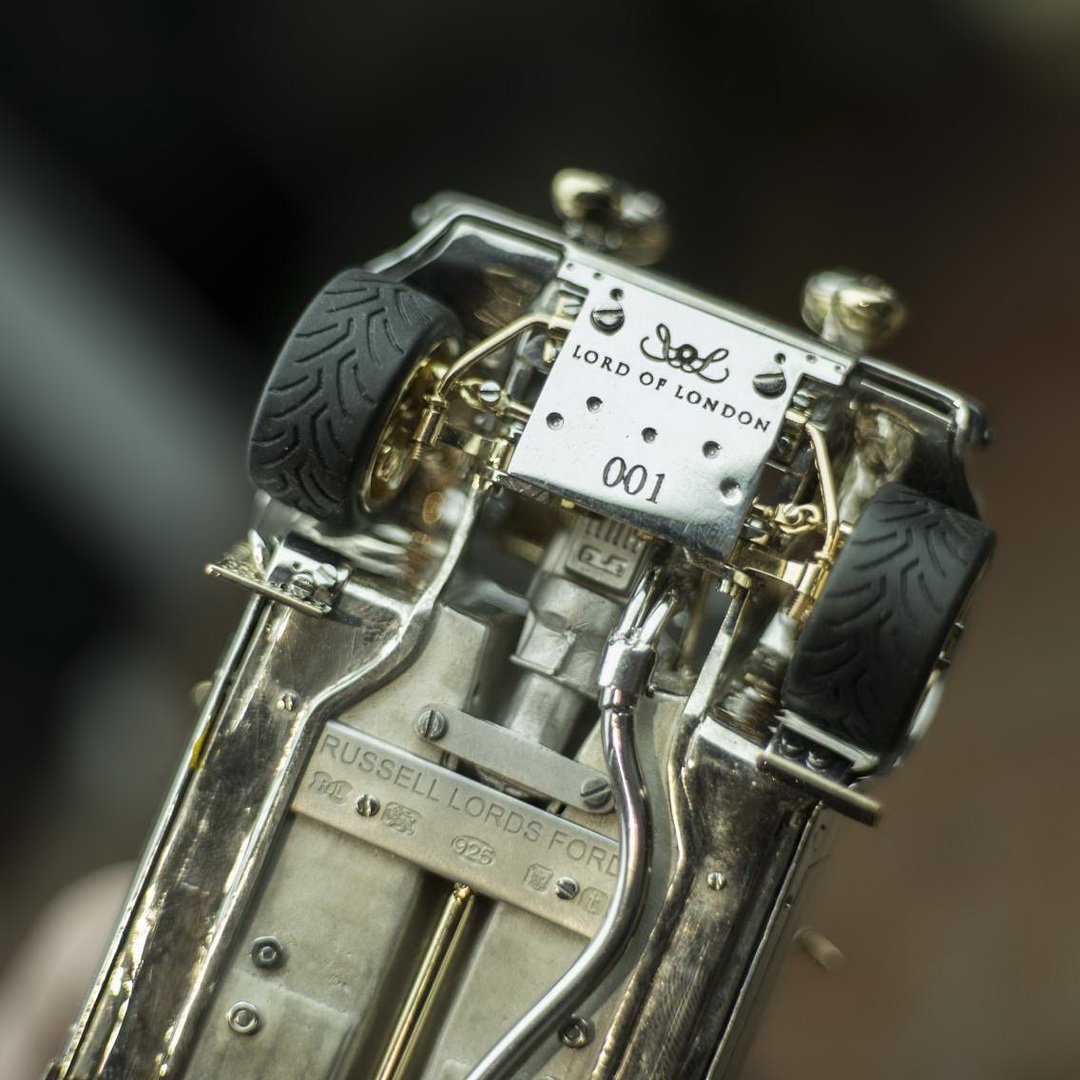Bilen er støbt i solidt sølv, mens fælgene er af guld. Det samme er i hængslerne til kølerhjelmen og detaljer på spoileren. Kølergrillen er skabt i hvidguld, og diamanter gør det ud for forlygter.