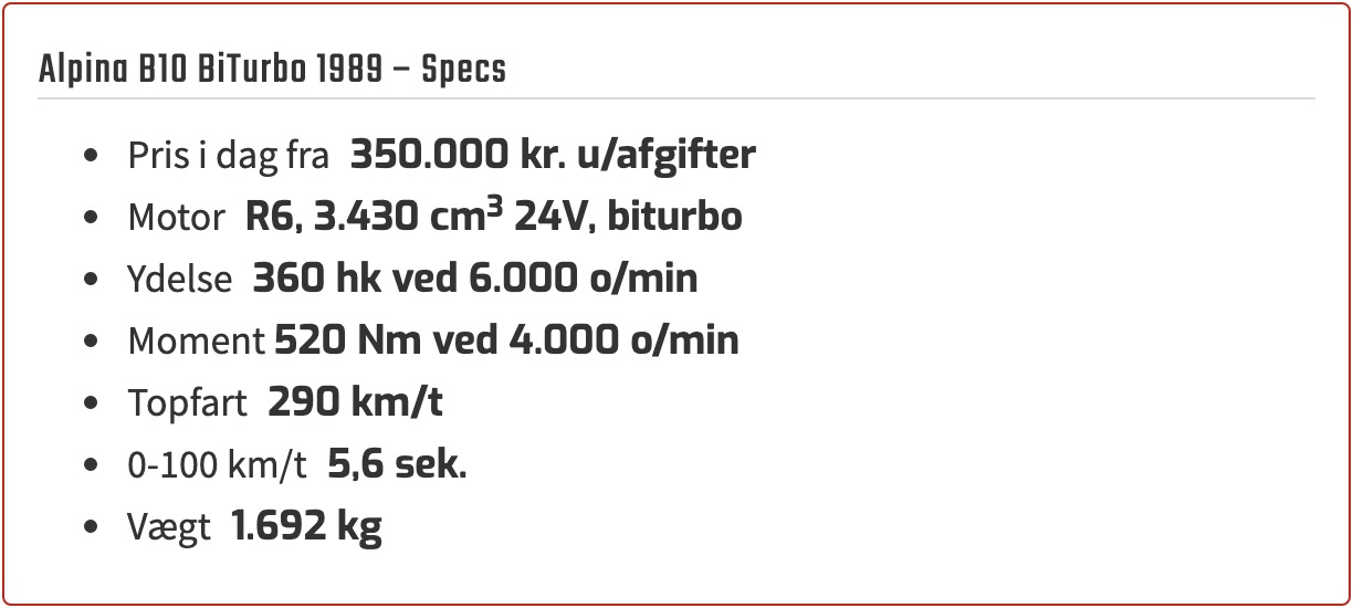 I Danmark kunne du få en BMW M5 i garagen, hvis du i 1990 betalte prisen på 1.148.835 kr. Ville du hellere have en Alpina B10 BiTurbo, skulle du gi’ mindst 1,5 mio. kr.