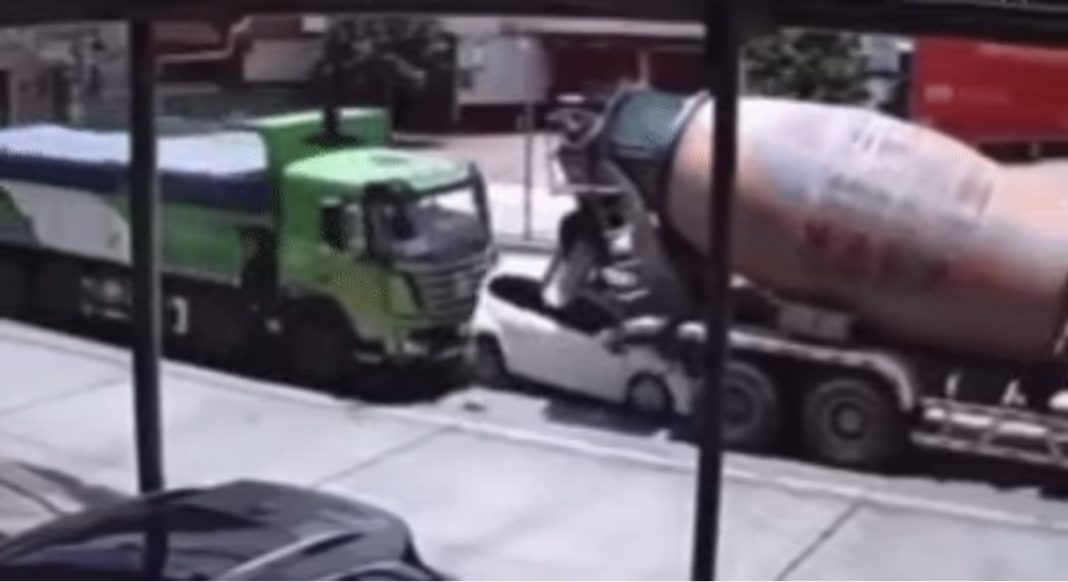 Formentligt har det reddet bilistens liv, at den forreste lastbil kørte med cenmentblander. Det har lige efterfladt nok afstand mellem lastbilens lad til en menneskekrop. For bilen? Ja, krøller sig sammen i løbet af et øjeblik.
