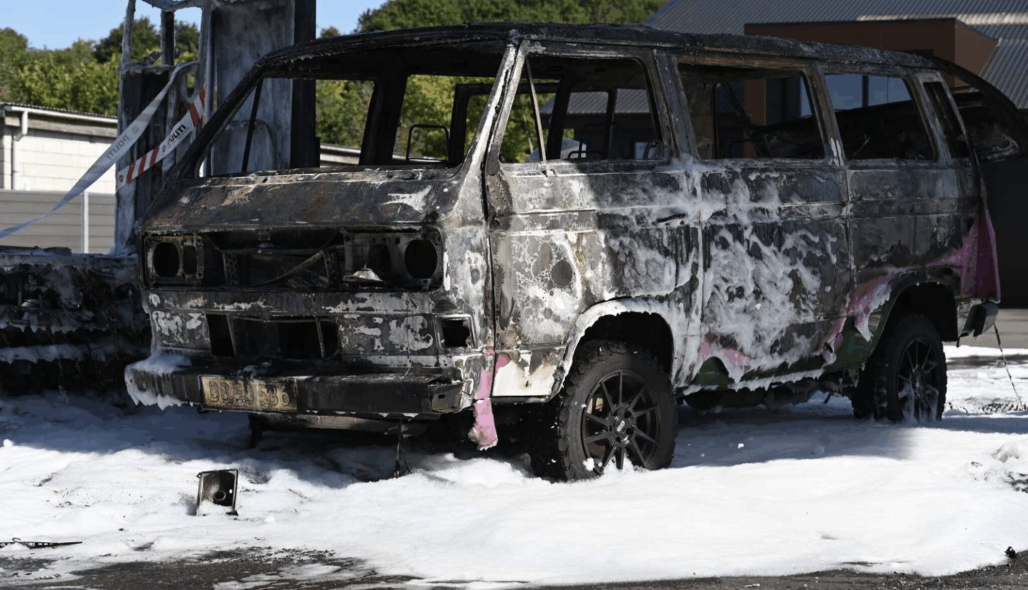 Den ældre Volkswagen udbrændte totalt ved branden. Den står ikke til at redde.
