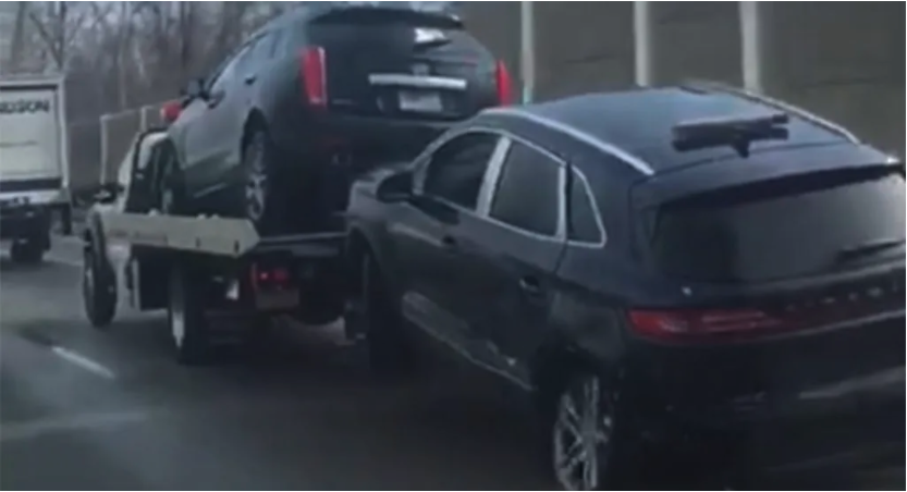 Den sorte Cadillac på ladet ser ok ud, men det stikker helt af med den Lincoln MKC, der er hægtet bag på. Nu er der ikke noget i vejen for at hægte en bil bag på en autotransporter. Det er faktisk meget normalt.